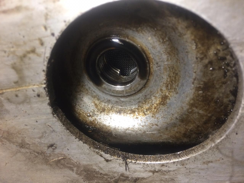 Еще важно перед началом нарезки замерить на какую глубину можно вкрутить метчик, чтобы не повредить маслозаборник, который может располагаться по ходу движения. После прохода метчиком номер один*, правим резьбу вторым номером*.