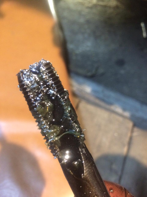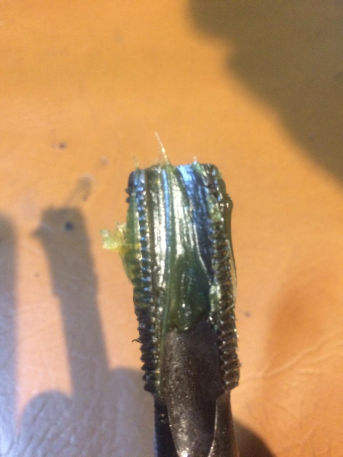 Метчик обильно обмазываем литолом, чтобы стружка с ним перемешивалась и не падала вовнутрь мотора.